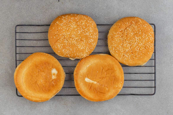 Die Brötchen aufschneiden und mit der Schnittseite nach unten auf einem Rost auf der mittleren Schiene im Ofen in 3–5Min. goldbraun aufbacken.