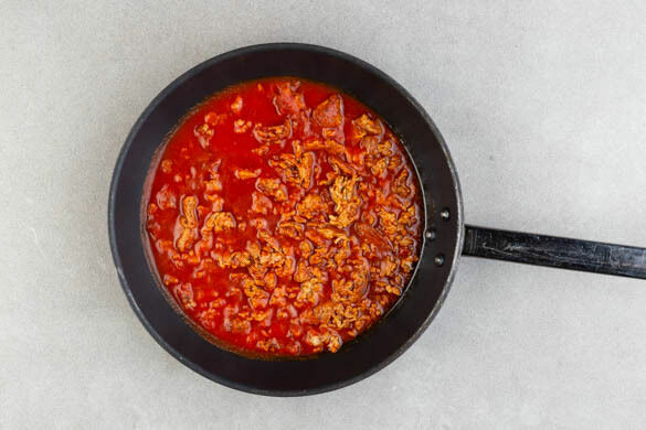 Die passierten Tomaten zugeben. Die Hitze reduzieren und die Sauce abgedeckt bei mittlerer Hitze 4–5Min. köcheln lassen.