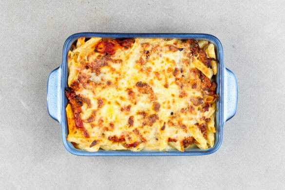 Die abgetropfte Pasta mit ⅔ der Béchamel vermengen. Die ½ des Käses in die Pastamischung reiben und untermischen. Die Pastamischung in eine mittelgroße Auflaufform geben und glatt streichen. Mit der Fleischsauce bedecken und mit der restlichen Béchamel abschließen. Den restlichen Käse darüberreiben und das Pastitsio in 10–15Min. im Ofen goldbraun backen.