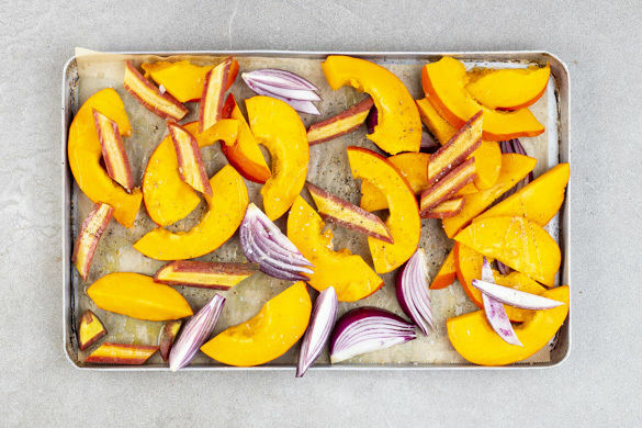 Den Kürbis, die Karotten und die Zwiebeln auf ein mit Backpapier ausgelegtes Backblech geben, mit 2EL Olivenöl sowie je 1 kräftigen Prise Salz und Pfeffer würzen und 15Min. im Ofen rösten. Den Knoblauch für die letzten 5Min. untermengen und mitbacken.