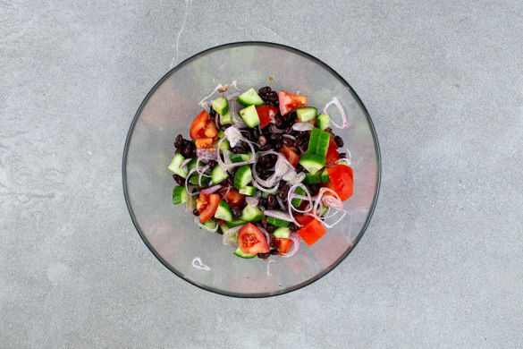 Die Bohnen in ein Sieb abgießen, mit kaltem Wasser abspülen und abtropfen lassen. Die Schalotte schälen und in feine Ringe schneiden. Die Gurke in ca. 1cm große Würfel schneiden. Die Bohnen, die Schalotten, die Gurken und die restlichen Tomaten vermengen.