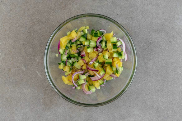 Die Ananas in einem Sieb abtropfen lassen und grob hacken. Die Ananas und die ½ der Zwiebeln unter die Gurken mengen.