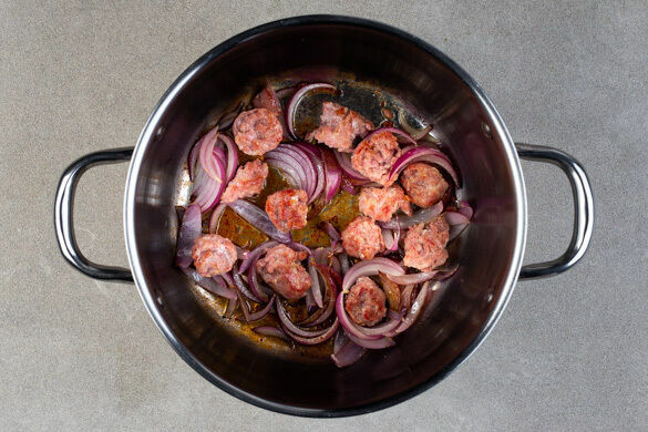 Die Würste von der Pelle befreien, in mundgerechte Stücke schneiden und in einem mittelgroßen Topf mit 1EL Olivenöl bei mittlerer bis niedriger Hitze ca. 4Min. braten, bis die Wurststücke goldbraun ist und sich leicht vom Topfboden lösen. Die Zwiebeln dazugeben und 2–3Min. mitbraten.