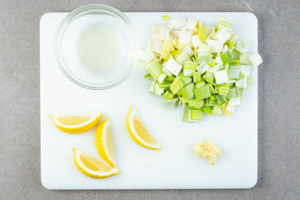 In einem Wasserkocher 1,2L Wasser zum Kochen bringen. Den Knoblauch schälen und fein würfeln. Die Zitrone halbieren und eine Hälfte auspressen, die andere Hälfte in Spalten schneiden. Den Lauch längs vierteln und in ca. 1cm breite Streifen schneiden.