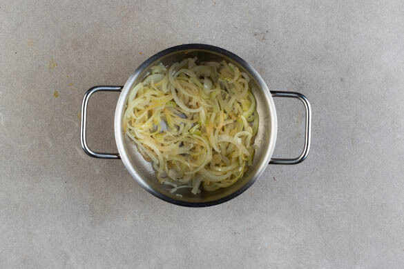 Die Zwiebeln schälen, halbieren und in dünne Streifen schneiden. In einem mittelgroßen Topf mit 2EL Olivenöl bei mittlerer Hitze 3–5Min. braten, bis die Zwiebeln weich und glasig sind.