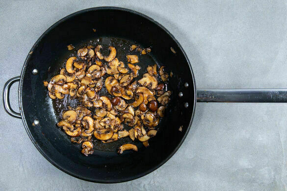 Die Pilze ggf. säubern und in dünne Scheiben schneiden. Den Knoblauch schälen und fein würfeln. Die Pilze in der großen Pfanne mit 2TL Olivenöl bei mittlerer bis starker Hitze 3–5Min. braten, dabei gelegentlich rühren. Erst die ½ des Knoblauchs, die Sojasauce und 2EL Balsamicoessig, dann den Ahornsirup unterrühren, bis die Pilze gleichmäßig von Sauce bedeckt sind.