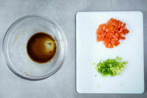 Die Pilze nach Geschmack mit Salz und Pfeffer würzen und vom Herd nehmen. Die Tomaten grob würfeln und die Lauchzwiebeln in feine Ringe schneiden. Den restlichen Knoblauch, 2TL Olivenöl und 1TL Balsamicoessig zu einem Dressing verrühren.