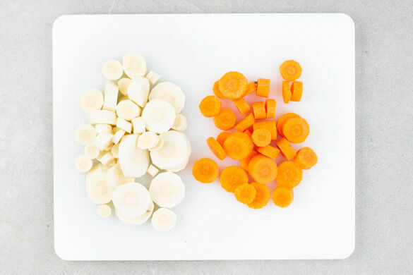 In einem mittelgroßen Topf ausreichend gesalzenes Wasser für das Gemüse zum Kochen bringen. Die Pastinake schälen und in dünne Scheiben schneiden. Die Karotte ggf. schälen und ebenfalls in Scheiben schneiden.