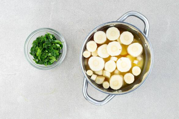 Die ½ der Kartoffeln schälen und in grobe Stücke schneiden, dann mit den Karotten und den Pastinaken in das kochende Wasser geben. Das Gemüse in 12–15Min. weich kochen, anschließend mit einer Tasse etwas Kochwasser abschöpfen. Das Gemüse in ein Sieb abgießen. Die Petersilie samt Stängeln fein hacken. Die übrigen Kartoffeln für ein anderes Rezept verwenden.