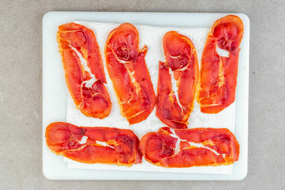 Den Schinken in der Pfanne mit 1EL Olivenöl bei mittlerer Hitze auf jeder Seite 1–2Min. braten, dann auf Küchenkrepp ruhen lassen. Je nach Größe der Pfanne den Schinken ggf. in mehreren Durchgängen braten.