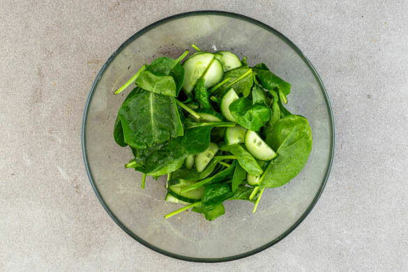 Die Gurke längs halbieren und in dünne Scheiben schneiden. Die Gurkenscheiben und den Spinat mit 1EL Olivenöl, 1EL Essig und je 1 Prise Salz und Zucker vermengen. Die Minzblätter von den Stängeln streifen und grob zerrupfen. Den Koriander samt Stängeln grob schneiden.