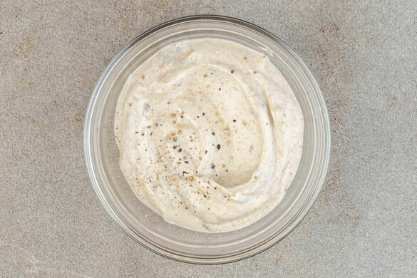 Den Joghurt und das Tahini mit 1TL Olivenöl und je 1 Prise Salz und Pfeffer verrühren.