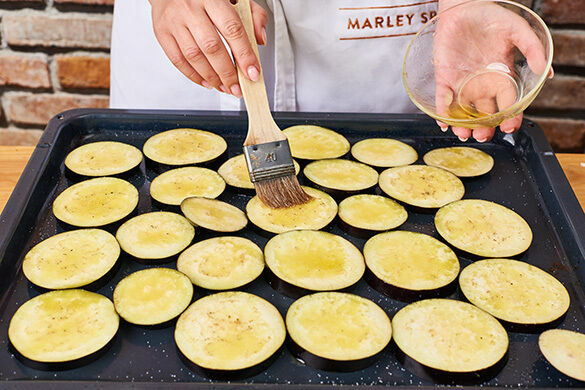 Die Auberginen auf ein oder zwei Backblechen verteilen und dünn mit Olivenöl bestreichen. Mit je 1 kräftigen Prise Salz und Pfeffer würzen und 5–8Min. im Ofen grillen, bis sie leicht bräunen. Die Brötchenstücke dazugeben und weitere 2–3Min. grillen, bis die Croûtons knusprig sind. Das Blech bzw. die Bleche aus dem Ofen nehmen und die Temperatur auf 220°C Ober-/Unterhitze umstellen.