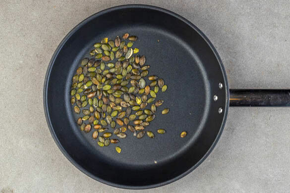 Die Kürbiskerne in einer großen Pfanne ohne Zugabe von Fett bei mittlerer Hitze 2–4Min. anrösten, bis sie knistern und goldbraun sind. Zum Abkühlen aus der Pfanne nehmen. Die Pfanne wird weiterverwendet.