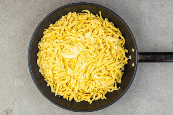 Den Dill samt Stängeln grob schneiden. 5Min. vor Ende der Backzeit die Spätzle, den Käse, das Brühgewürz und 300ml Wasser mit 2EL Olivenöl in der Pfanne bei mittlerer Hitze ca. 5Min. unter ständigem Rühren braten, bis die Spätzle gleichmäßig mit Käsesauce bedeckt sind.