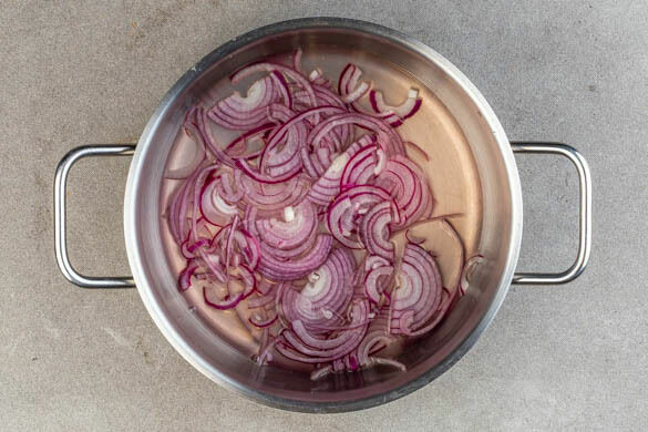Die Zwiebel schälen, halbieren und in feine Streifen schneiden. In einem kleinen Topf 50ml Wasser, 50ml Essig, 1TL Zucker und ½TL Salz aufkochen. Die Zwiebeln in den Topf geben, sofort vom Herd nehmen und beiseitestellen.
