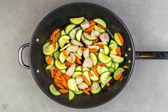 Die Karotten mit 2EL Pflanzenöl in einer mittelgroßen Pfanne bei mittlerer Hitze in 3–5Min. bissfest anbraten. Die Zucchini und das Fleisch in die Pfanne geben und 3–5Min. mitbraten, bis das Fleisch leicht gebräunt ist. Mit je 1 kräftigen Prise Salz und Pfeffer würzen.
