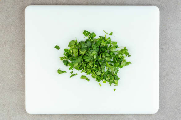 Den Koriander samt Stängeln grob schneiden. Das Curry auf dem Reis anrichten und mit dem Koriander und den eingelegten Zwiebeln garniert servieren.