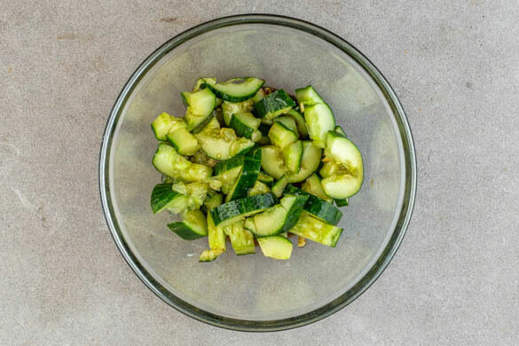 Währenddessen die Gurke auf ein Brett legen und mit einem Nudelholz oder einer schweren Pfanne so lange schlagen, bis die Gurke auf- bzw. in Stücke bricht. Die Gurke längs halbieren, dann quer in ca. 1cm breite Stücke schneiden. Mit der ½ des Knoblauchs, 1EL hellem Essig, der ½ der Sojasauce, der ½ des Sesamöls und je 1 Prise Salz und Zucker vermengen.