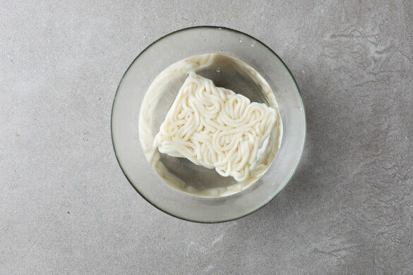 Die Nudeln mit dem kochenden Wasser bedecken und in 3–5Min. gar ziehen lassen.