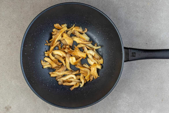 Die Pilze in mundgerechte Stücke zupfen und in einem Wok oder einer großen Pfanne mit 4EL Pflanzenöl bei mittlerer Hitze goldbraun und knusprig anbraten, das dauert 2–4Min. Dabei nur einmal pro Minute umrühren. Die Nudeln in ein Sieb abgießen und kalt abschrecken.