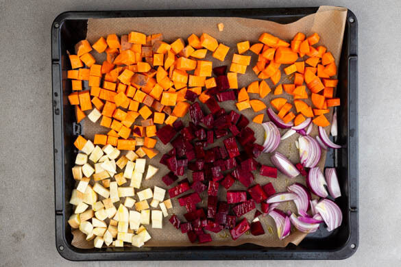 Den Backofen auf 200ºC (180ºC Umluft) vorheizen. Die Rote Bete schälen und würfeln. Tipp: Da Rote Bete stark färbt, beim Verarbeiten am besten Küchenhandschuhe und Schürze tragen. Die Zwiebel schälen, halbieren und in Spalten schneiden. Die Karotte, die Pastinake und die Süßkartoffel samt Schale in grobe Würfel schneiden.
