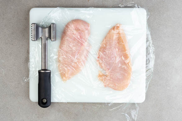Das Fleisch trocken tupfen, horizontal halbieren und zwischen zwei Lagen Frischhaltefolie mit einem Fleischklopfer, dem Boden einer schweren Pfanne oder dem Boden eines schweren Topfes flach klopfen. Das Fleisch mit 1EL Olivenöl sowie je 1 Prise Salz und Pfeffer einreiben.