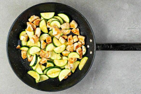Das Fleisch trocken tupfen und in mundgerechte Stücke schneiden, dann in der zweiten großen Pfanne mit 2EL Olivenöl und 1 kräftigen Prise Salz bei mittlerer bis starker Hitze ca. 3Min. rundum goldbraun anbraten. Die Zucchini dazugeben und bei mittlerer Hitze weitere 6–8Min. braten. Die Pfanne vom Herd nehmen, sobald die Zucchini weich und das Fleisch gar ist.