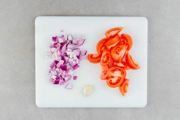 Die Zwiebeln schälen, halbieren und mittelfein würfeln. Den Knoblauch mit dem Handballen oder einem Messer platt drücken und die Schale entfernen. Die Tomaten achteln.