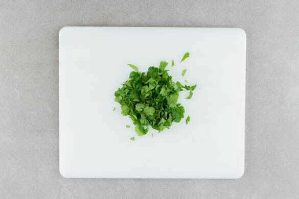Den Koriander samt Stängeln grob schneiden. Das Saag auf dem Reis anrichten und mit dem Koriander garniert servieren.