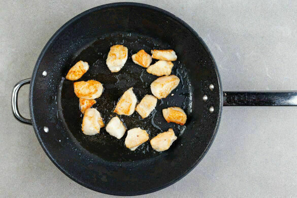 Das Fleisch trocken tupfen und mit je ½TL Salz und Pfeffer würzen. In der restlichen Maisstärke wenden, bis es vollständig bedeckt ist. Das Fleisch mit 4EL Pflanzenöl in einer zweiten großen Pfanne bei mittlerer bis starker Hitze 5–6Min. braten, bis es goldbraun und gar ist.
