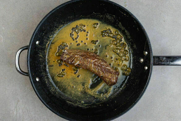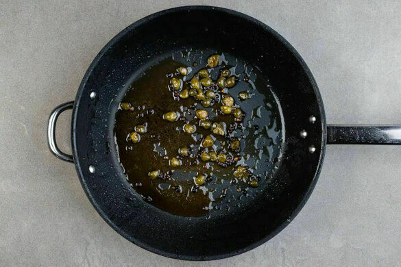 Die Kapern und die Pfefferkörner in derselben Pfanne bei mittlerer Hitze 1–2Min. anbraten, dann mit 250ml Wasser ablöschen und mit 1 kräftigen Prise Salz würzen. Die Sauce unter Rühren zum Kochen bringen und 3–4Min. einköcheln lassen.
