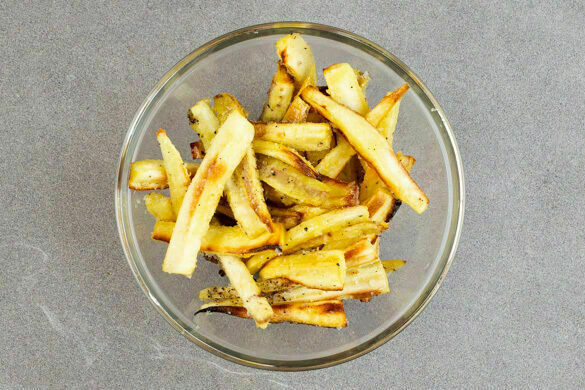 Den Backofen auf 240°C (220°C Umluft) vorheizen. Die Pastinaken längs vierteln und in dünne Spalten schneiden. Mit 2EL Olivenöl und 1TL Salz vermengen, gleichmäßig auf zwei mit Backpapier ausgelegten Backblechen verteilen und im Ofen in 18–20Min. goldbraun und knusprig rösten. Nach der Hälfte der Zeit die Position der Bleche tauschen. Bei geöffneter Ofentür ca. 5Min. abkühlen lassen.