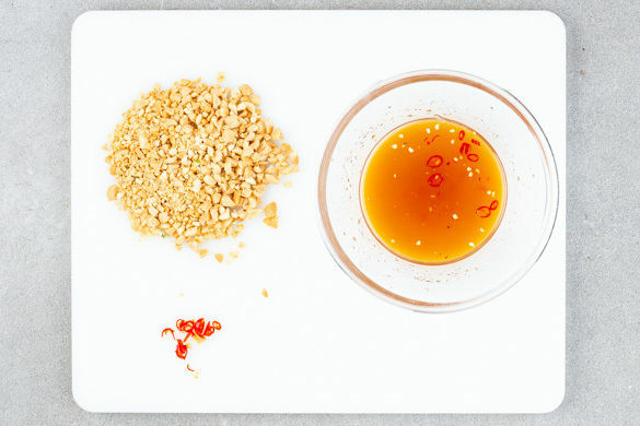 Die Chilischote in feine Ringe schneiden, ggf. für weniger Schärfe die Kerne entfernen. Die Limette halbieren und auspressen. Den Limettensaft mit 2TL Fischsauce, der Sweet-Chili-Sauce, 1EL Olivenöl, 1TL Honig oder (braunem) Zucker und der 1/2 der Chiliringe zu einem Dressing verrühren. Die Erdnüsse hacken.