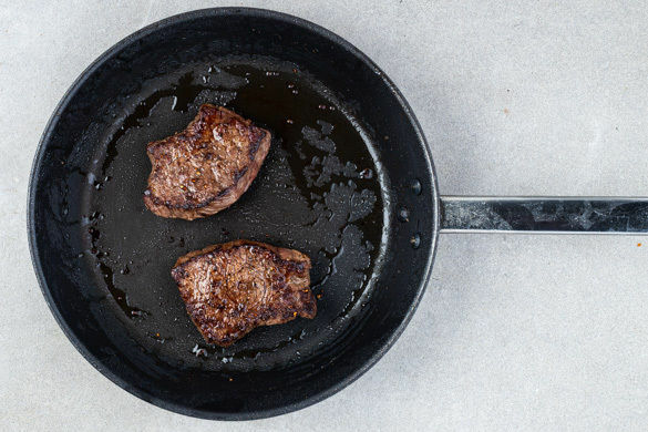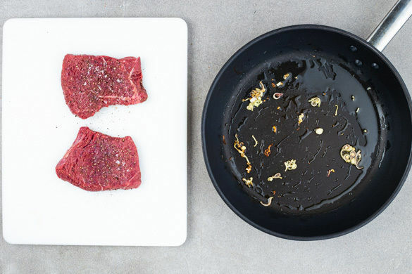 Das Fleisch in der Pfanne mit dem Zitronengrasöl bei starker Hitze 2–3Min. anbraten. Wenden und weitere 2–3Min. braten, dann in etwas Alufolie einwickeln und ruhen lassen.
