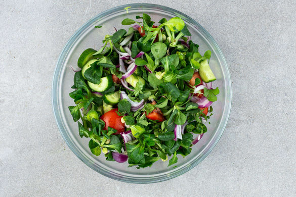 Die Tomaten grob würfeln, dabei den Strunk entfernen. Die Gurke längs halbieren und quer in dünne Scheiben schneiden. Die Zwiebel schälen, halbieren und in feine Streifen schneiden. Die Kräuter samt Stängeln fein schneiden. Die 1/2 der Kräuter mit den Tomaten, den Gurken und dem Feldsalat vermengen.