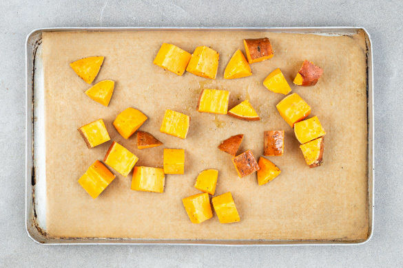 Den Backofen auf 220°C Umluft (240°C Ober-/Unterhitze) vorheizen. Die Süßkartoffel samt Schale in ca. 2cm große Würfel schneiden, auf einem mit Backpapier belegten Backblech mit 1EL Olivenöl sowie Salz vermengen und 15–20Min. im Ofen goldbraun rösten.