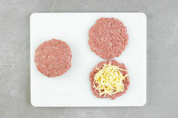 Das Hackfleisch mit je ½TL Salz und Pfeffer würzen und in 8 gleich große Portionen teilen und 8 Pattys in Größe der Brötchen formen. Den Käse auf 4 Pattys verteilen, mit je 1 Patty bedecken und die Ränder gut verschließen, damit der Käse beim Braten nicht herausfließt.