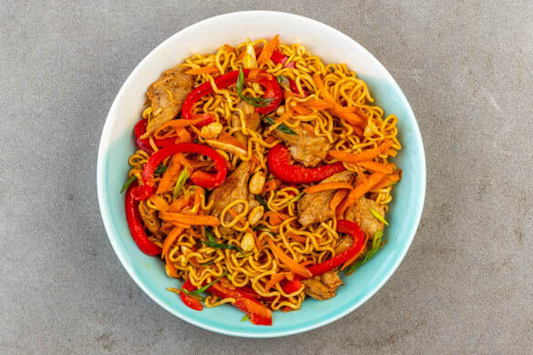 Heute gibt es einen köstlichen Klassiker aus der asiatischen Küche: Die gebratenen Mie-Nudeln mit den leckeren veganen Hähnchenschnetzeln von Heura, geraspelten Karotten und feinen Paprikastreifen sind ruckzuck auf dem Tisch und einfach immer wieder gut. Sie werden mit leckerem Sesamöl beträufelt und mit knackigen Erdnüssen garniert – ein Genuss für Klein und Groß!