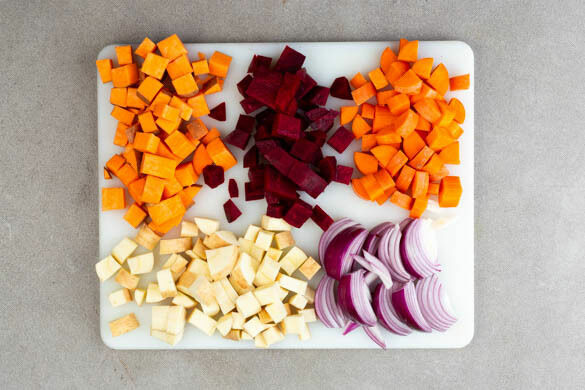 Den Backofen auf 200ºC (180ºC Umluft) vorheizen. Die Rote Bete schälen und würfeln. Tipp: Da Rote Bete stark färbt, beim Verarbeiten am besten Küchenhandschuhe und Schürze tragen. Die Zwiebel schälen, halbieren und in Spalten schneiden. Die Karotte, die Pastinake und die Süßkartoffel samt Schale in grobe Würfel schneiden.