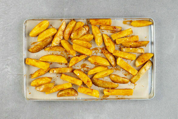 Den Backofen auf 240°C (220°C Umluft) vorheizen. Die Kartoffeln samt Schale in fingerdicke, pommesartige Streifen schneiden. Auf zwei mit Backpapier ausgelegten Backblechen mit 1–2TL Paprikapulver, 2EL Olivenöl und 1TL Salz vermengen, dann im Ofen 20–25Min. backen, bis die Pommes goldbraun sind. Noch 5–10Min. bei leicht geöffneter Tür im Ofen lassen, so werden sie extra knusprig.