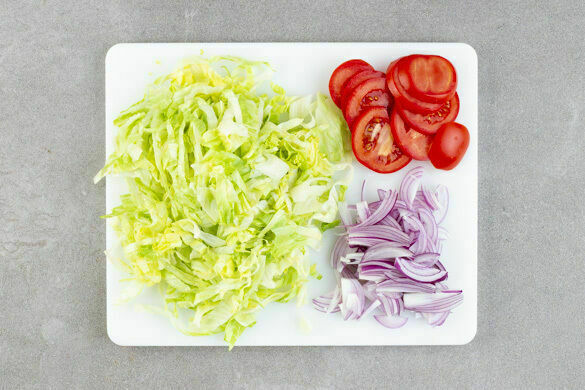 Den Salat in dünne Streifen schneiden, dabei den Strunk entfernen. Die Tomaten in dünne Scheiben schneiden. Die Zwiebeln schälen, halbieren und in dünne Streifen schneiden.