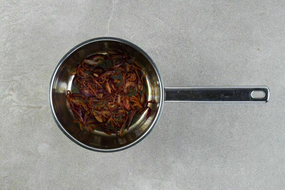 2EL Zucker in einem kleinen Topf bei mittlerer Hitze schmelzen, dabei nicht umrühren. Die Zwiebeln sowie 2 Prisen Salz und 2EL Essig hinzufügen und bei niedriger Hitze unter gelegentlichem Rühren 2–3Min. karamellisieren, bis die Zwiebeln weich werden.
