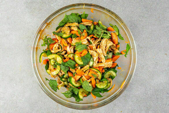 Das Fleisch mit den Händen oder zwei Gabeln in dünne Streifen zerkleinern und mit dem Gemüse vermengen. Nach Belieben mit Salz und Pfeffer abschmecken.
