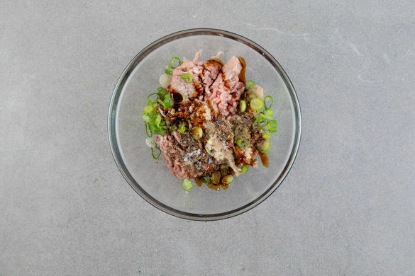 In einem mittelgroßen Topf ausreichend gesalzenes Wasser für die Nudeln zum Kochen bringen. Das Hackfleisch mit den Semmelbröseln, der ½ der Lauchzwiebeln, der ½ der Teriyakisauce sowie je 1 Prise Salz und Pfeffer gut verkneten und die Hackfleischmasse zu 10–12 gleich großen Hackbällchen formen.