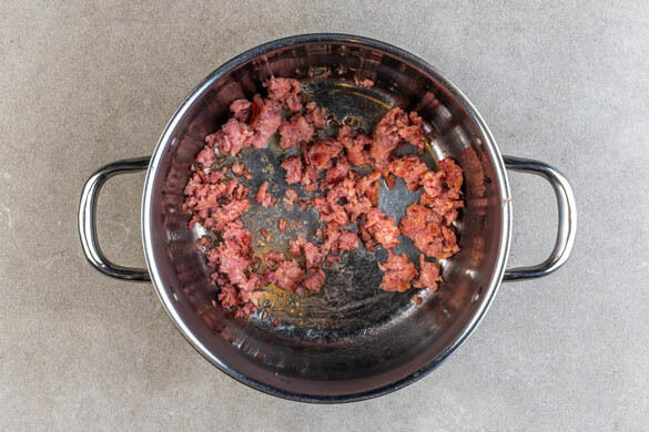 Die Schweinswurst mit einem scharfen Messer von der Pelle befreien und in einem mittelgroßen Topf mit 1EL Olivenöl bei mittlerer Hitze in 3–4Min. leicht anbräunen lassen, dabei das Brät mit einem Kochlöffel zerteilen.