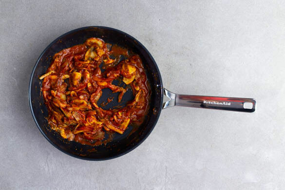Die BBQ-Sauce, die Gewürzmischung, das Tomatenmark und 200ml Wasser in die Pfanne rühren und 1–3Min. köcheln lassen, bis eine sämige, glänzende Sauce entsteht. Mit Salz und Pfeffer abschmecken.