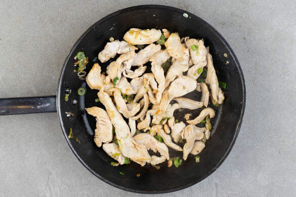 Das Fleisch trocken tupfen und in derselben Pfanne mit 2EL Pflanzenöl bei starker Hitze ca. 2Min. anbraten, dann die Lauchzwiebeln hinzufügen und ca. 1Min. mitbraten. Mit je ½TL Salz und Pfeffer würzen.
