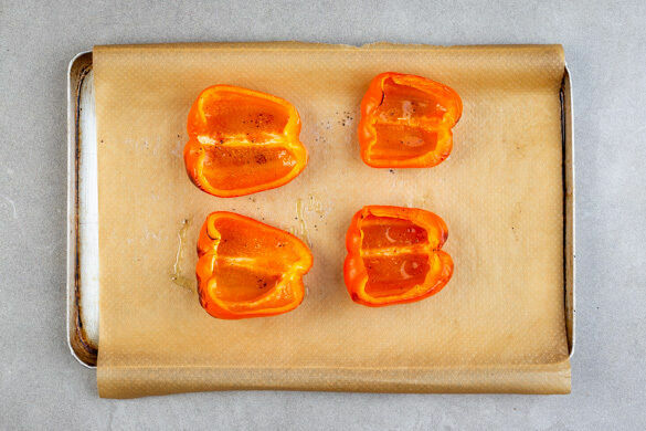 Inzwischen die Paprika der Länge nach halbieren, das Kerngehäuse entfernen und die Paprika mit der Schnittseite nach oben auf ein mit Backpapier ausgelegtes Backblech geben. Mit 2EL Olivenöl beträufeln und mit je 1 Prise Salz und Pfeffer würzen, dann ca. 10Min. im Ofen vorbacken. Anschließend aus dem Ofen nehmen und die Temperatur auf 250°C (230°C Umluft) erhöhen.