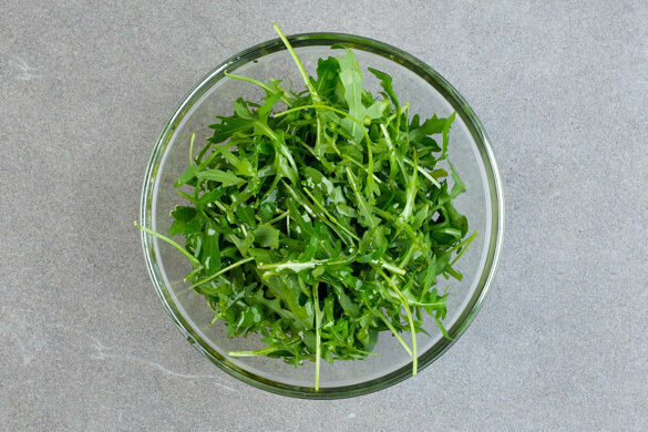Inzwischen die Zwiebeln schälen, halbieren und fein würfeln. Die ½ der Chilischote halbieren, entkernen und fein würfeln. Tipp: Wer mag, kann mehr oder weniger Chilischote verwenden. Ca. ¼ des Rucola klein hacken, den übrigen Rucola nur einmal durchschneiden. Die Zitrone halbieren und eine Hälfte auspressen, die andere Hälfte in Spalten schneiden.